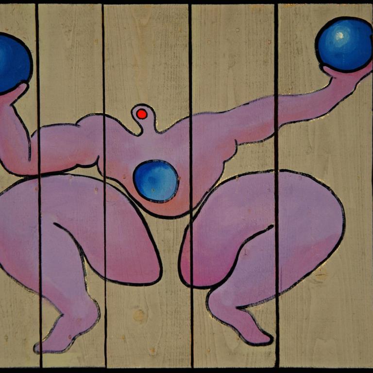 Das zweite, das dem Bild auf der Holzpalette einen speziellen Charakter verleiht, sind die nicht vorhandenen, die nicht bemalten Flächen, d.h. die Astlöcher und die Spalten zwischen den Brettern.