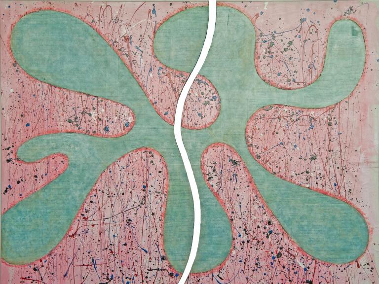 Collage, Papier und Leinwand auf Spanplatte und Holz mit einem Wellenschnitt geteilt
