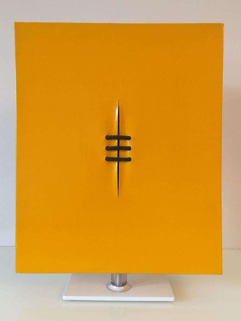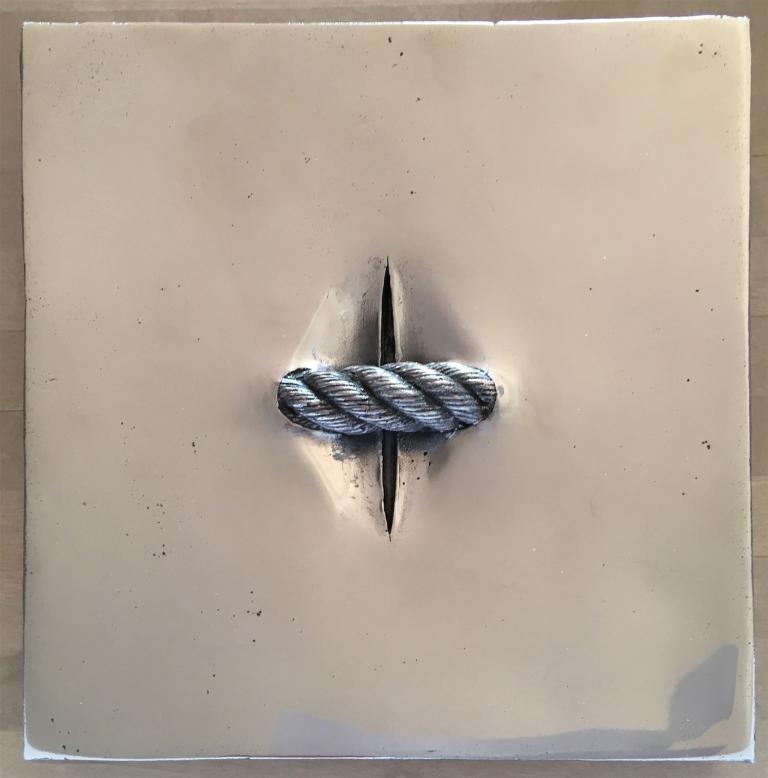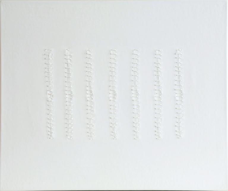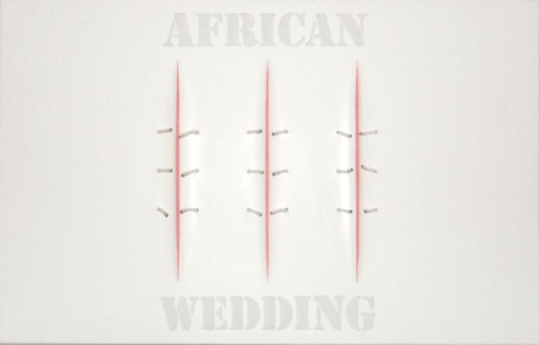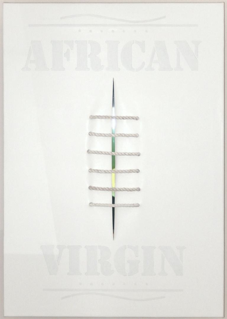 So entstand ein Zyklus auf Leinwänden, die mit der Sugar Coat-Technik aufwändig bearbeitet als „African Virgin“ gestaltet wurden. Die ersten Leinwände waren ausschließlich weiß. Das eigentliche Thema FGM wurde durch Schnüre und Seile dargestellt, die einen Schnitt in der Leinwand verbanden. Teilweise habe ich die Schnitte mit farbigem LED-Licht, digitalen Bilderrahmen oder live TV-Bilder des Kinderkanals hinterlegt.